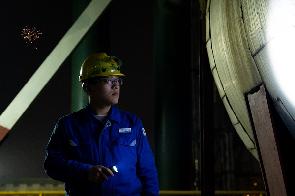 遠處夜色籠罩下的城市,在節(jié)日煙花的映襯下,流光溢彩,分外迷人。又是一年萬家燈火時,又是一年闔家團圓日。今晚的夜色格外美麗,卻讓人無心去欣賞,化工人背后的那份溫暖與感動讓人們的心久久難以平靜。裝置區(qū)機器的隆隆聲依舊,有機器運轉(zhuǎn)的地方就會有巡查人員忙碌的身影,他就是雙甲車間合成崗位的劉超,此刻的他像極了默默付出的幕后英雄,用執(zhí)著與敬業(yè)為設(shè)備的安全運行保駕護航。