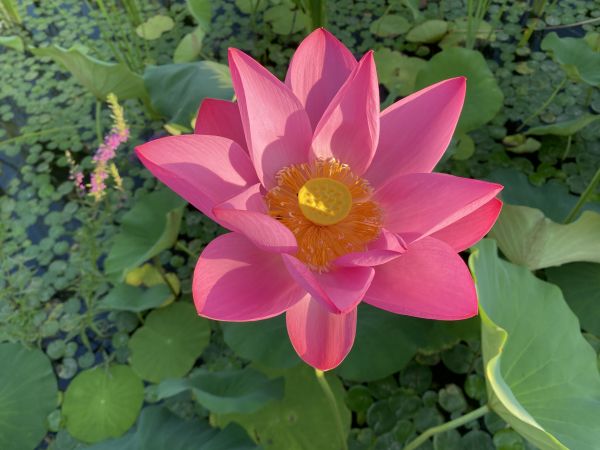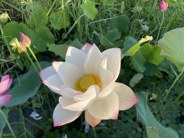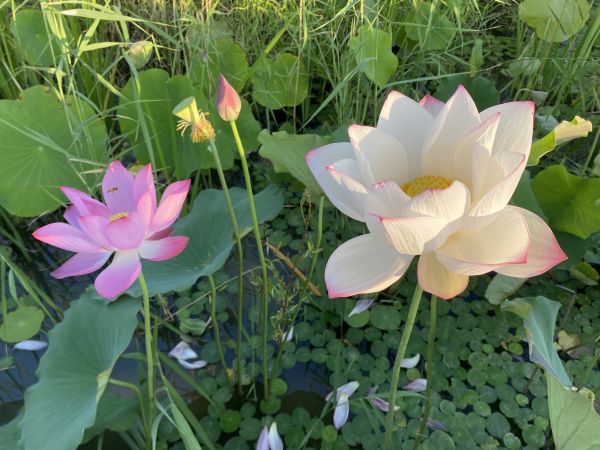 周末清晨六點,和好友相約到南湖公園賞荷花。走進公園沿著木橋靠近湖面,恰逢太陽慢慢升起,在水面折射出七彩光暈,微風吹過平靜的水面,給湖面留下陣陣漣漪。只見荷葉中每朵荷花都是出污泥而不染,淡雅純凈使人陶醉。靜靜欣賞著這亭亭玉立的荷花,看著蜜蜂在荷花上飛來飛去,腦海中不由得想起《愛蓮說》中的:予獨愛蓮之出淤泥而不染,濯清漣而不妖,中通外直,不蔓不枝”這句詩詞。是啊,荷花雖出自淤泥之中,卻纖塵不染,出自于清水之中卻又不妖媚,荷花展現在世人面前的就是一種高貴正直的象征,同時也是清廉的象征。